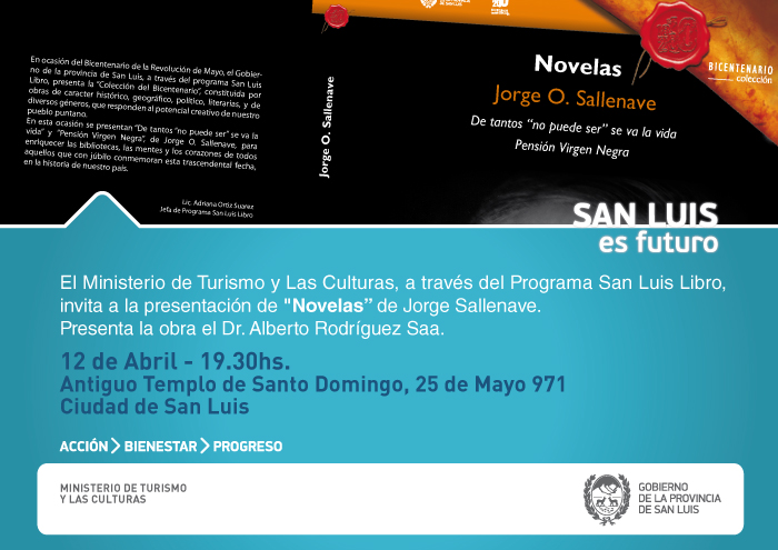 El Programa San Luis Libro, dependiente del Ministerio de Turismo y Las Culturas, presentará e «Novelas» de Jorge Sallenave que se realizará el próximo viernes 12 de abril, a las 19.30, en el Antiguo Templo Santo Domingo, ubicado en la calle 25 de Mayo 971, San Luis.